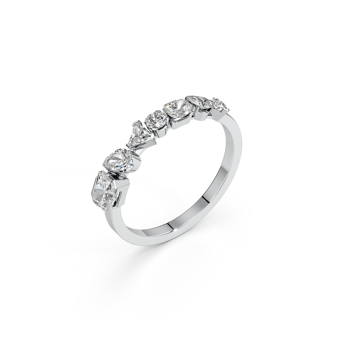 The Metamorphosis Multi Diamond Ring captures motion and growth in its asymmetric stones. This 18K recycled gold ring is hand-crafted in our atelier. It is fashioned around a row of seven diamonds. The round, radiant, trillion and pear cut lab-grown diamonds are set on the shank, all held in a mix of prong and half bezel settings to help accentuate their unique shape and radiance. Make a statement by wearing it unadorned, or layer with other Metamophosis pieces for a sculptural stack. Available in yellow, white and rose gold.