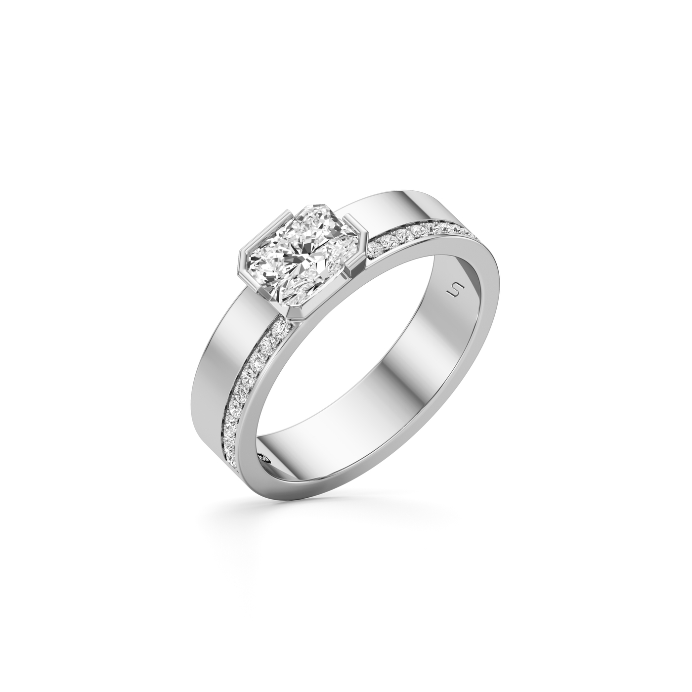 The Meta Radiant Pavé Diamond Gold Band reimagines the classic radiant-cut diamond to express evolution in form, complemented by pavé-set diamonds. Crafted in a half-bezel setting that reflects light with sculptural precision, this ring captures a chapter in a personal story of becoming. All Unsaid jewels are handcrafted from lab-grown diamonds and 18K recycled gold. Powered by renewable energy, our methods and materials are certified carbon neutral.