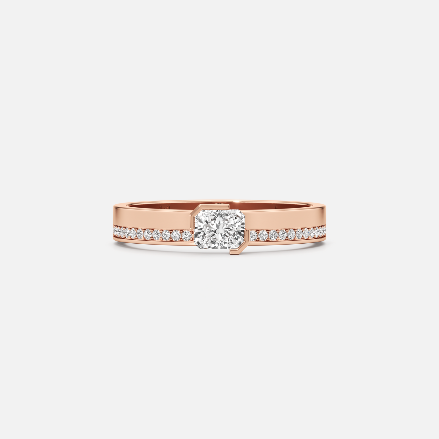 The Meta Diamond Radiant Pavé Band for men showcases a radiant-cut diamond in a contemporary half-bezel setting, handcrafted by our master artisans to enhance its stunning shape and dazzling 69 facets. Mounted on a thick gold band lined in pavé diamonds, this men's ring represents the transformative power of love. All Unsaid jewels are handcrafted from lab-grown diamonds and 18K recycled gold. Powered by renewable energy, our methods and materials are certified carbon neutral.
